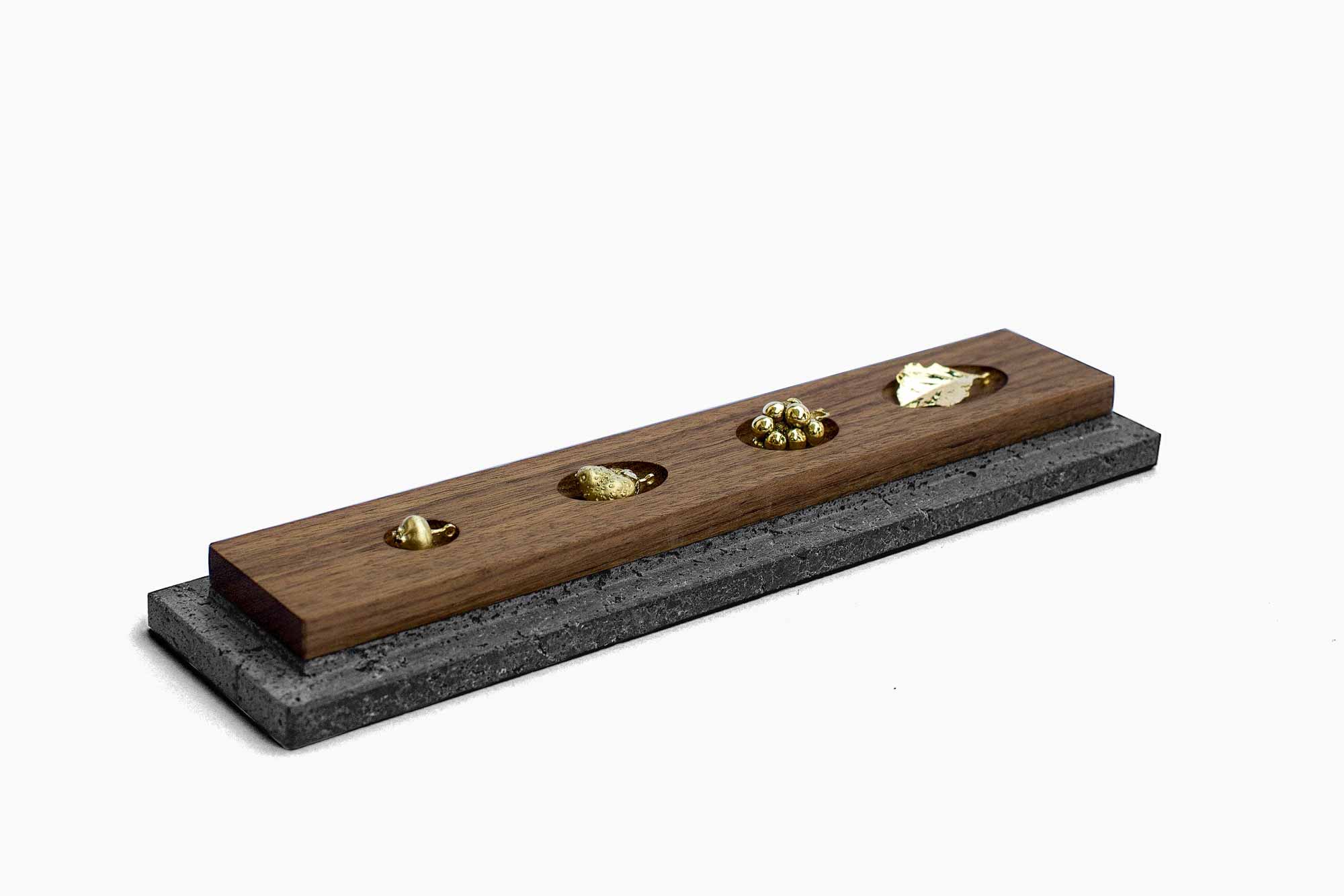 Inspiriert von den geheimnisvollen Unvollkommenheiten urbaner Pflanzen hat MONYA/HELMUT diese einzigartige Schönheit eingefangen und in 18k Gold verewigt. Die Kollektion ist eine Hommage an die flüchtige Eleganz urbaner Flora und verkörpert ihre Anmut in vier luxuriösen Stücke, die kunstvoll zu matten und glänzenden Oberflächen poliert wurden. In Zusammenarbeit mit einem Steinmetzmeister und einem Goldschmied geschaffen, werden diese exquisiten Stücke in einer Steinbox präsentiert, die aus Mayener Basaltlava gefertigt wurde. Die Box wird durch eine 3D-gefräste Einlage aus poliertem und gewachstem kanadischen Walnussholz veredelt und verleiht der Komposition eine elegante Note.
